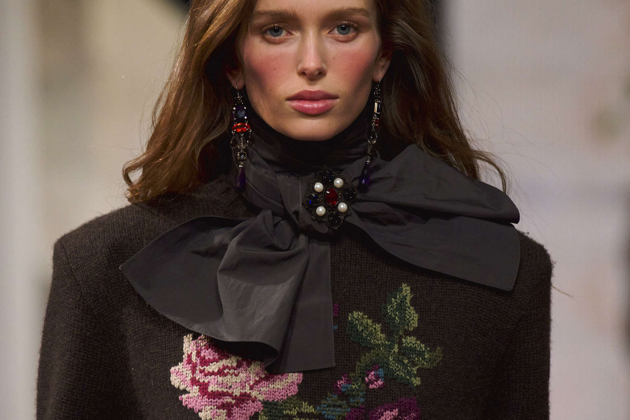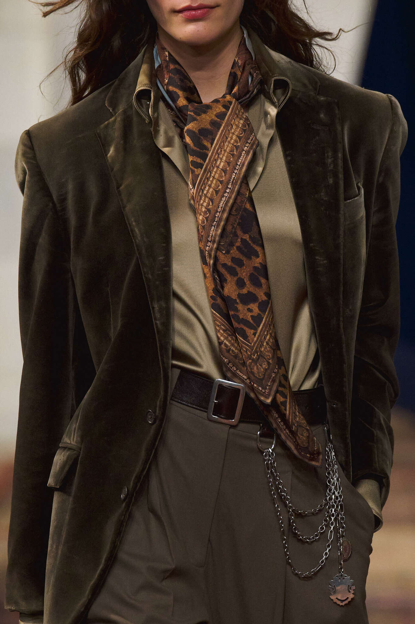 Terciopelo oscuro, lana compacta y tweed clásico aportaron peso visual y dimensión táctil. Los detalles metálicos —cinturones, broches y herrajes discretos— introdujeron un contraste sutil que actualizó la propuesta sin alterar su esencia romántica.